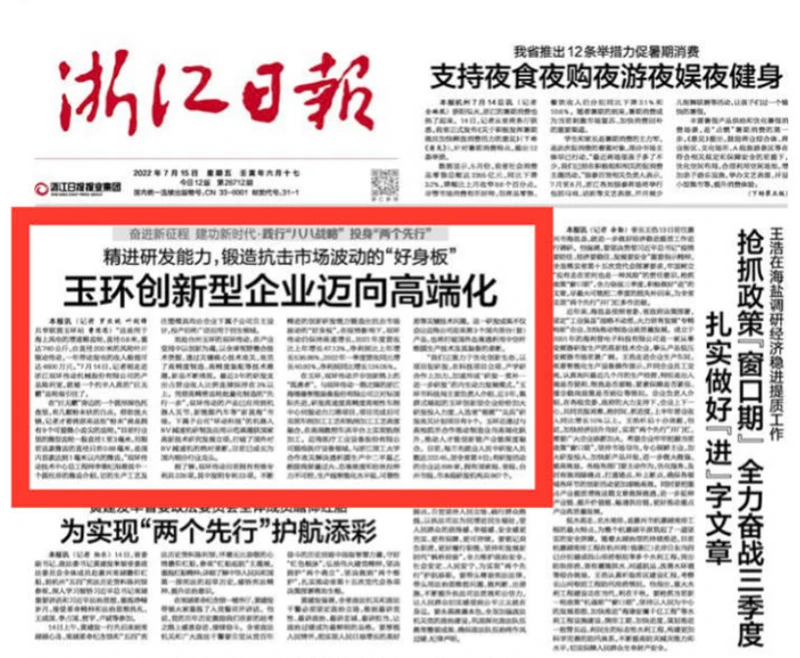 7月15日,《浙江日报》头版头条刊发了题为《精进研发能力,锻造抗击市场波动的“好身板” ,玉环创新型企业迈向高端化》文章,用大篇幅报道了蜜桃传媒在研发创新领域的生动详实的案例。